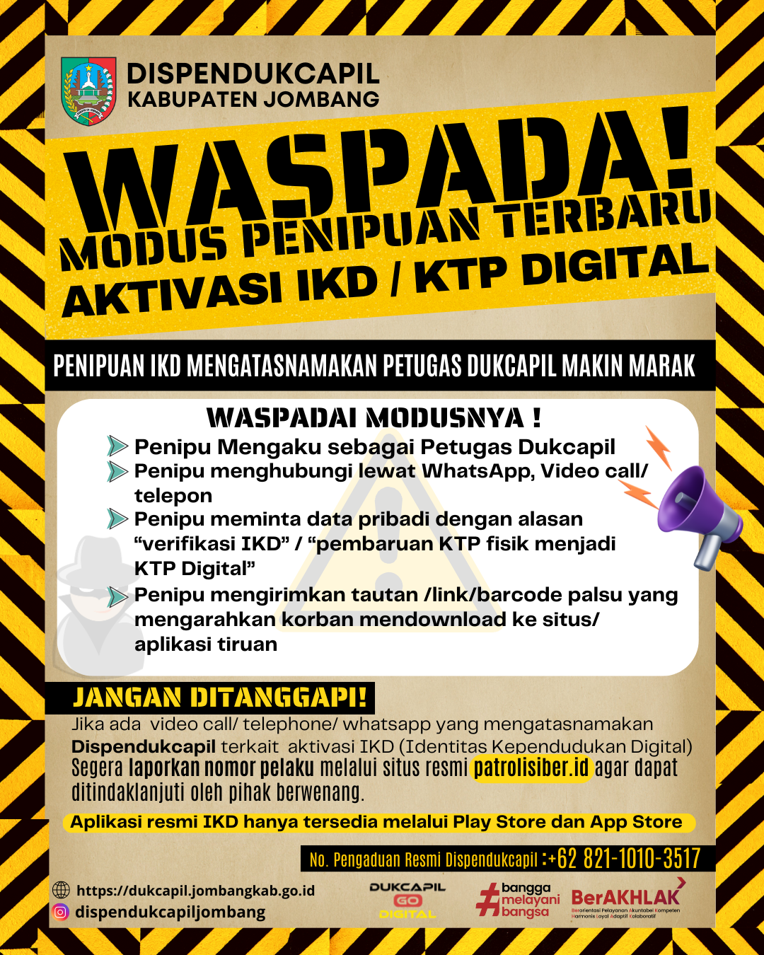 Dispendukcapil Jombang menghimbau kapada seluruh masyarakat Jombang untuk selalu waspada jika ada pihak-pihak yang mengatasnamakan petugas Dispendukcapil Jombang untuk meminta data/verifikasi data yang menghubungi via telepon/ Whatsapp. Melalui kegiatan Webinar bertajuk "Dukcapil Menyapa Masyarakat" yang diadakan oleh Ditjen Dukcapil Kementerian Dalam Negeri pada Selasa (17/6/2025), Ditjen Dukcapil Kemendagri memberikan informasi penting dan edukasi pencegahan penipuan digital melalui Identitas Kependudukan Digital (IKD).