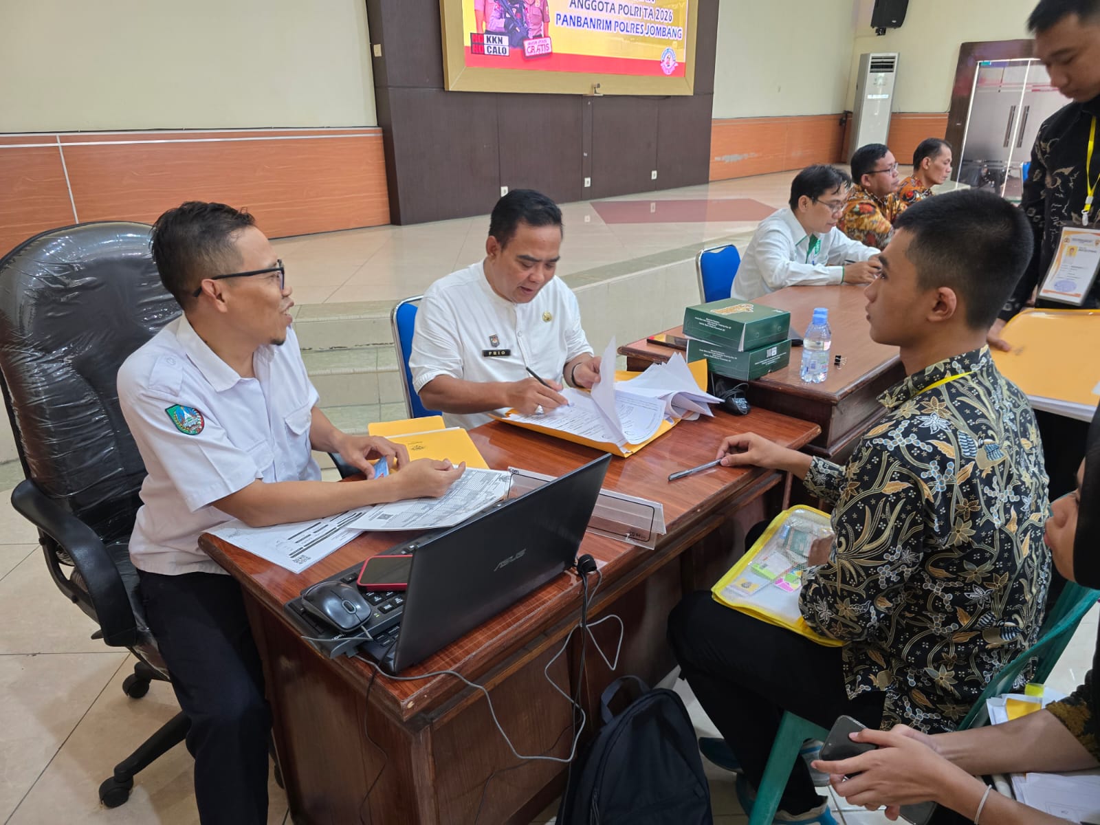 JOMBANG — Dinas Kependudukan dan Pencatatan Sipil (Dispendukcapil) Kabupaten Jombang melakukan pemeriksaan berkas persyaratan administrasi calon Bintara Polri, Rabu (01/04) 2026. Kegiatan tersebut berlangsung di Ruang Rupatama Kantor Polres Jombang sebagai bagian dari tahapan pemeriksaan akhir keabsahan dokumen kependudukan para peserta seleksi.