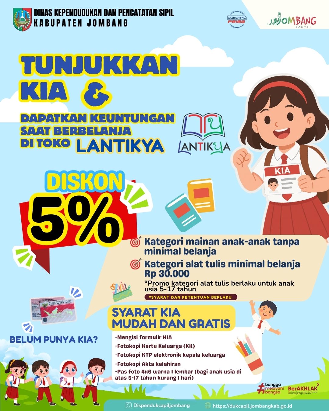 Kerja sama ini merupakan langkah strategis dalam memberikan manfaat nyata Kartu Identitas Anak (KIA). Melalui perjanjian tersebut, anak-anak pemegang KIA berusia 5–16 tahun berhak memperoleh potongan harga saat berbelanja di Toko Lantiknya dengan cara menunjukkan kartu KIA kepada kasir (syarat & ketentuan berlaku).